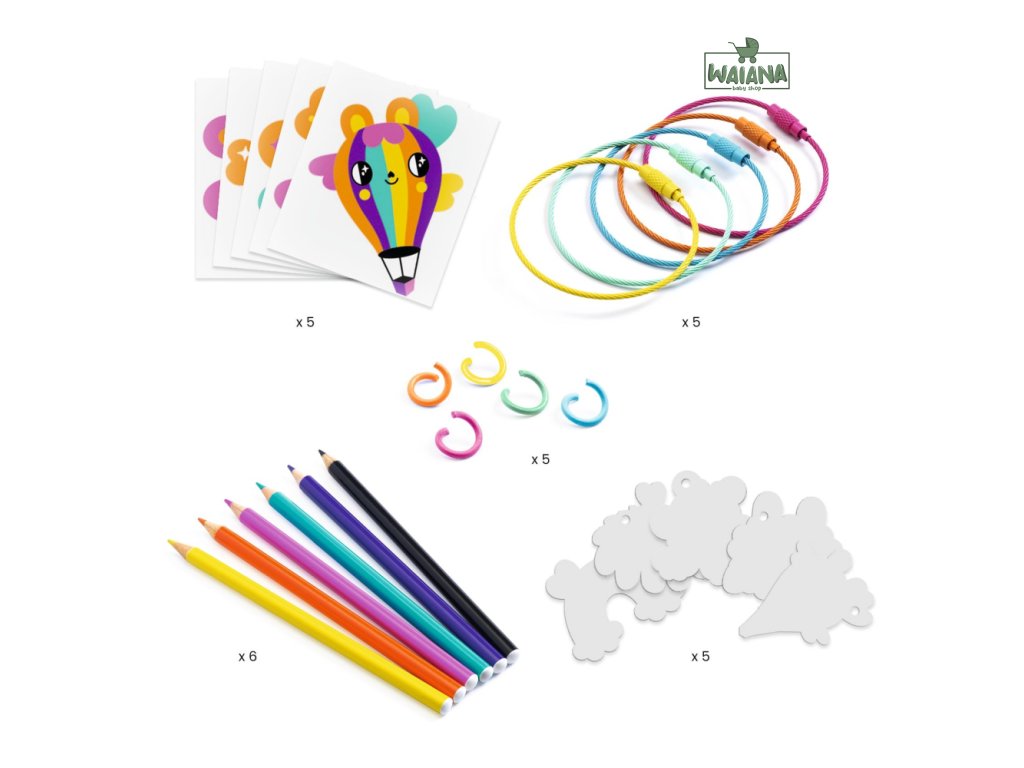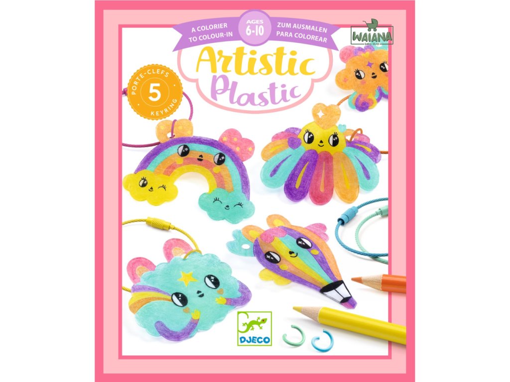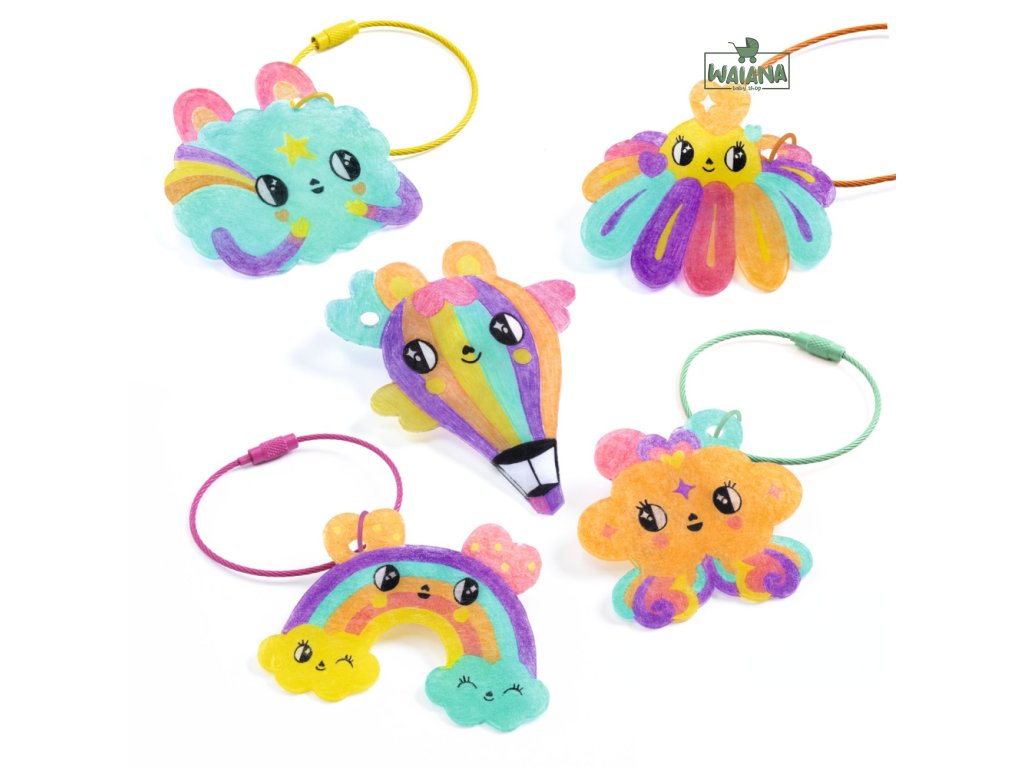 Výroba príveskov Dúha Vyrobte si vlastné dúhové prívesky. Malá sada Artistic magického plastu na zhotovenie 5 príveskov na kľúče s pestrými veselými kawaii motívmi. Dieťa si vyberie priehľadný plastový diel a príslušnú predlohu, ktorú naň prekreslí farbičkami. Vyfarbené plastové diely vloží do rúry, kde sa zakrátko scvrknú na pevný plastový prívesok. Na kľúče ho pripevní kovovým lankom so skrutkovacím uzáverom. Výrobou prevedie obrázkový návod.Kolekcia Artistic obsahuje malé kreatívne sady, ktoré oboznamujú zvedavé tvorivé deti srôznymi výtvarnými technikami. Obsah: 5 priehľadných dielov z magického plastu na vyfarbenie, 5 kovových laniek so skrutkovacím uzáverom, 5 spájacích krúžkov, 5 predlôh, 6 mini farbičiek, 1 obrázkový návod.