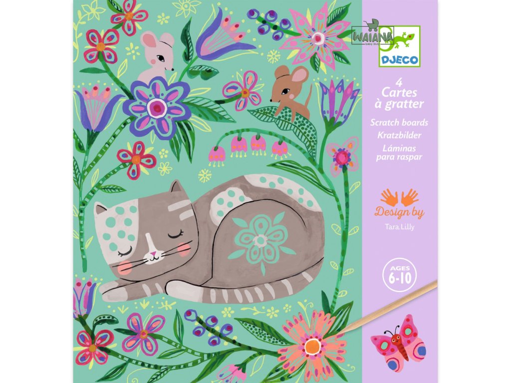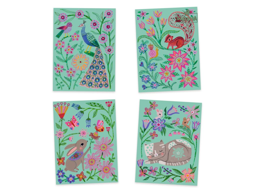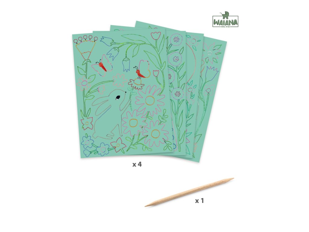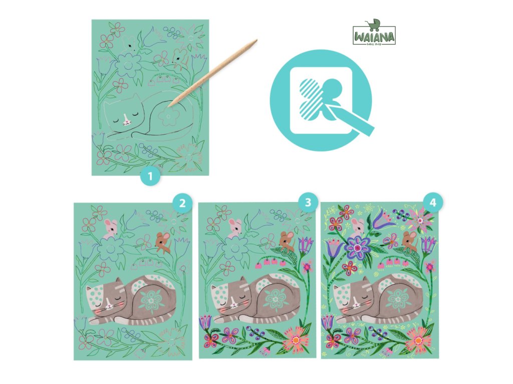 Vyškrabávanie Stretnutia v záhrade Sada 4 vyškrabovacích obrázkov s motívom zvieratiek v kvitnúcej záhradke. Vyškrabávaním vzorov do pastelovozelenej krycej vrstvy sa odkrývajú krásne farby. Obrázky sú plné kvetov. Vzory sú zložitejšie, aktivita je určená pre staršie deti a je výborná na podporenie presnej, trpezlivej práce. Procesom tvorby prevedie obrázkový návod. Vyrobené z papiera s ekologickým certifikátom FSC®.Obsah: 4 vyškrabovacie obrázky, obojstranná drevená škrabka, obrázkový návodRozmery obrázkov: 15 x 20 cm