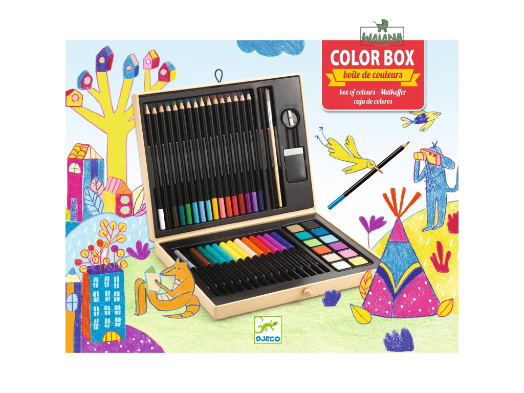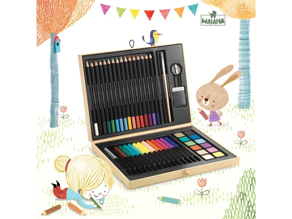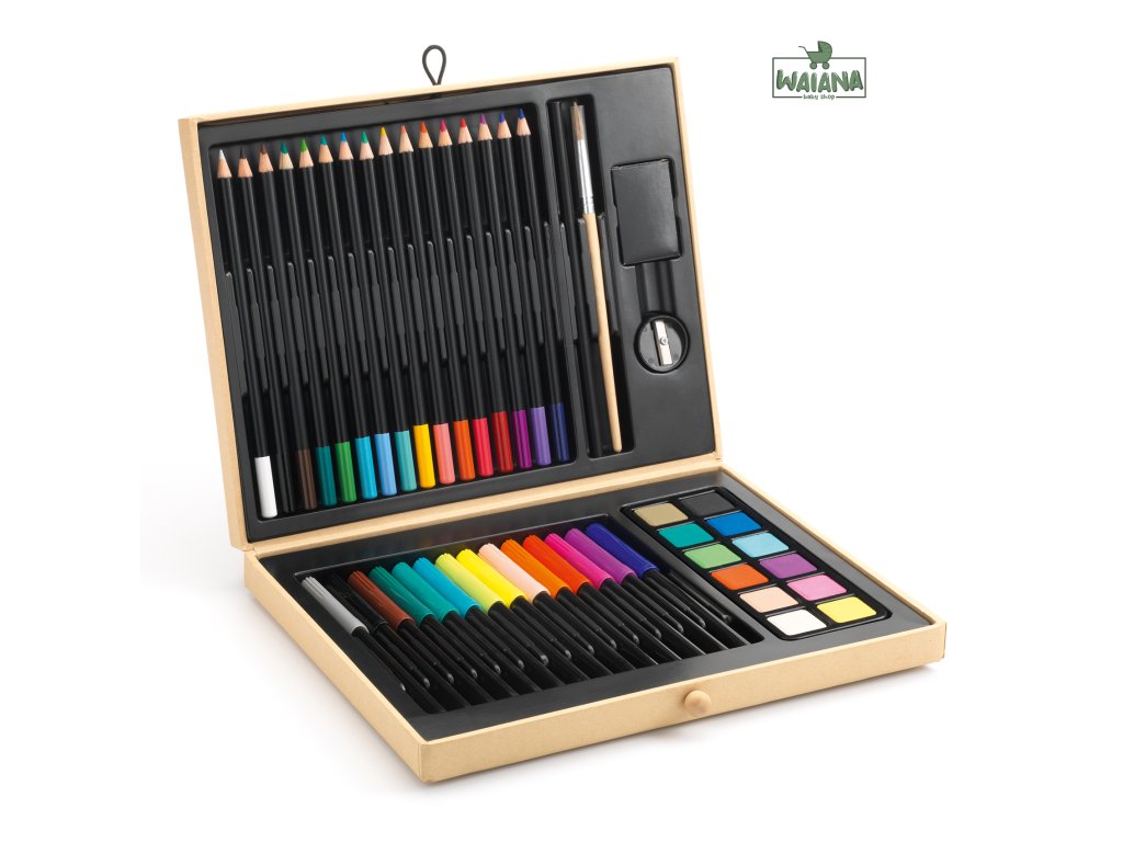 Výtvarný kufrík s obalom na vyfarbenieKreatívna výtvarná sada, ktorú si môžeš vyzdobiť podľa sebaVýtvarný kufrík s obalom na vyfarbenie je skvelá kreatívna sada pre deti, ktorá obsahuje kvalitné farbičky, fixky, vodové farby, štetec, ceruzku, strúhadlo a gumu na gumovanie. Kufrík slúži nielen ako praktické úložisko pre farby, pastelky a štetce, ale jeho obal si môže dieťa vyzdobiť vlastnými farebnými ilustráciami podľa fantázie. Po vyfarbení tak vznikne originálny kufrík, ktorý motivuje deti k ďalšej tvorbe.Prečo si vybrať kufrík od Djecovhodný pre deti od 5 rokovobsahuje priestor pre všetky obľúbené výtvarné potrebyobal si dieťa môže vyfarbiť vlastnými farbamipodporuje kreativitu a sebavyjadrenieideálny ako darček alebo kreatívna sada domaČo sada rozvíja u detíkreativitu a fantáziu pri tvorbe obrázkov a dizajnovjemnú motoriku pri manipulácii s farbami a nástrojmischopnosť kombinovať rôzne výtvarné technikytrpezlivosť pri dotváraní dielzmysel pre farby, kompozíciu a sebavyjadrenieObsah baleniakufrík s výtvarnými potrebami:16 farbičiek14 fixiek12 vodových fariebštetecceruzkastrúhadloguma na gumovanie