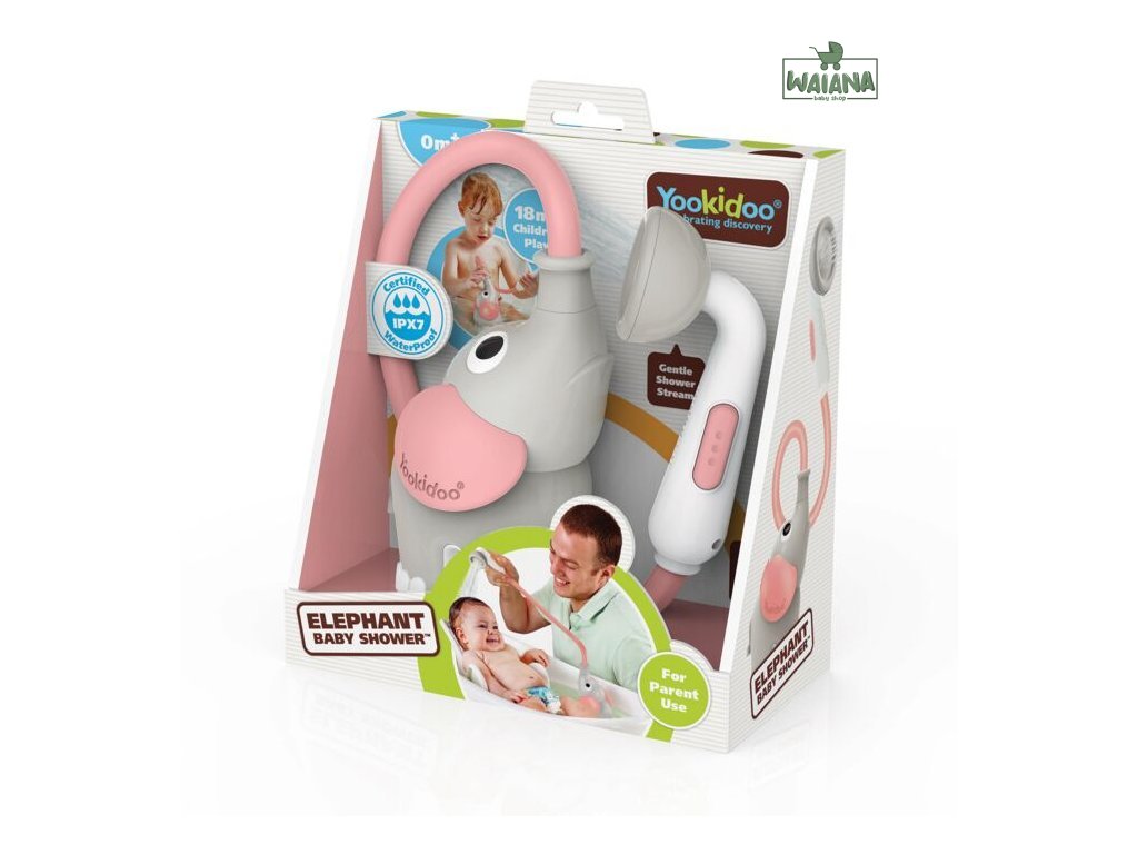 Umiestnite sprchovú základňu - slona do vody a zaistite minimálnu hĺbku vody 10 cm. Pre aktiváciu prúdenia vody stlačte tlačidlá umiestnené na bočných stranách sprchovej hlavice. Priložte prúd vody na nohy dieťaťa. Keď je dieťa spokojné, použite sprchu aj na zvyšok tela. Akonáhle dieťa sedí samo, ukážte mu, ako má aktivovať detskú sprchu. Podporujte jeho hygienické návyky, nezávislosť a zábavu.