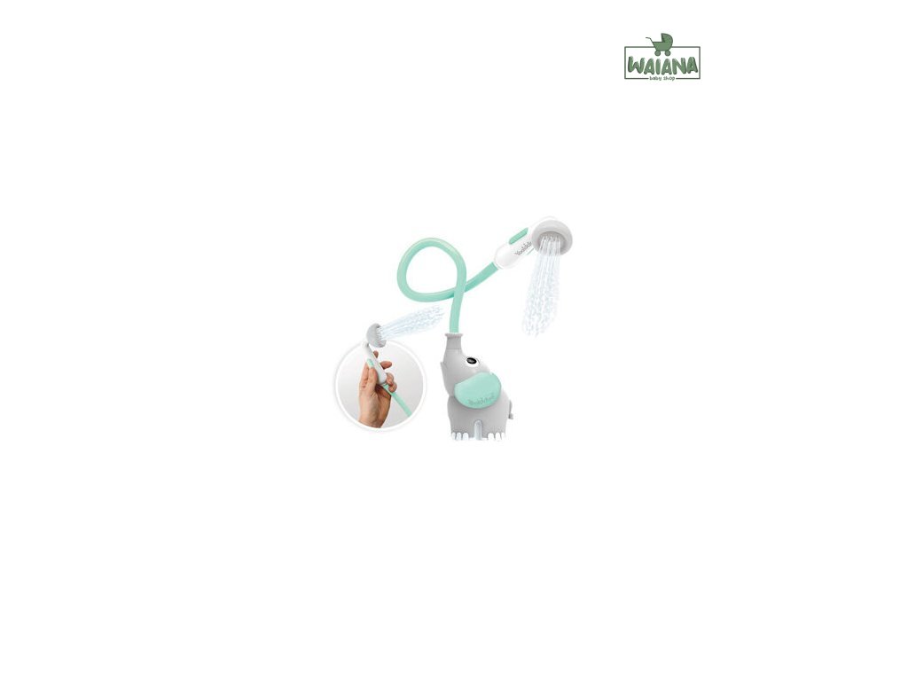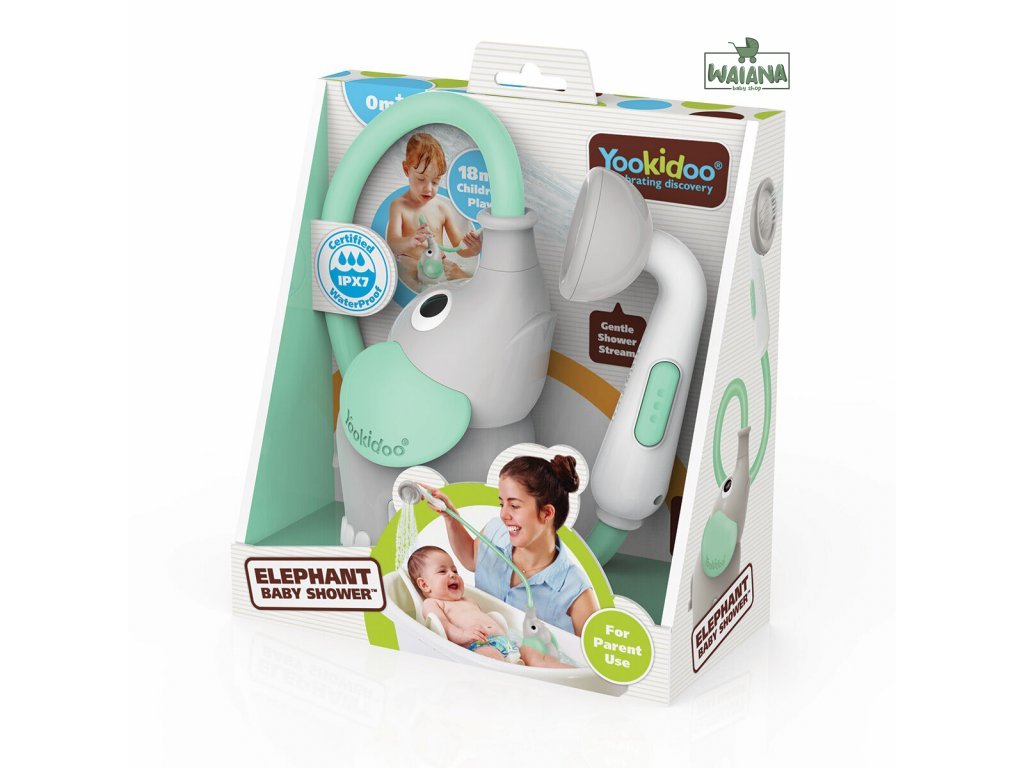 Umiestnite sprchovú základňu - slona do vody a zaistite minimálnu hĺbku vody 10 cm. Pre aktiváciu prúdenia vody stlačte tlačidlá umiestnené na bočných stranách sprchovej hlavice. Priložte prúd vody na nohy dieťaťa. Keď je dieťa spokojné, použite sprchu aj na zvyšok tela. Akonáhle dieťa sedí samo, ukážte mu, ako má aktivovať detskú sprchu. Podporujte jeho hygienické návyky, nezávislosť a zábavu.