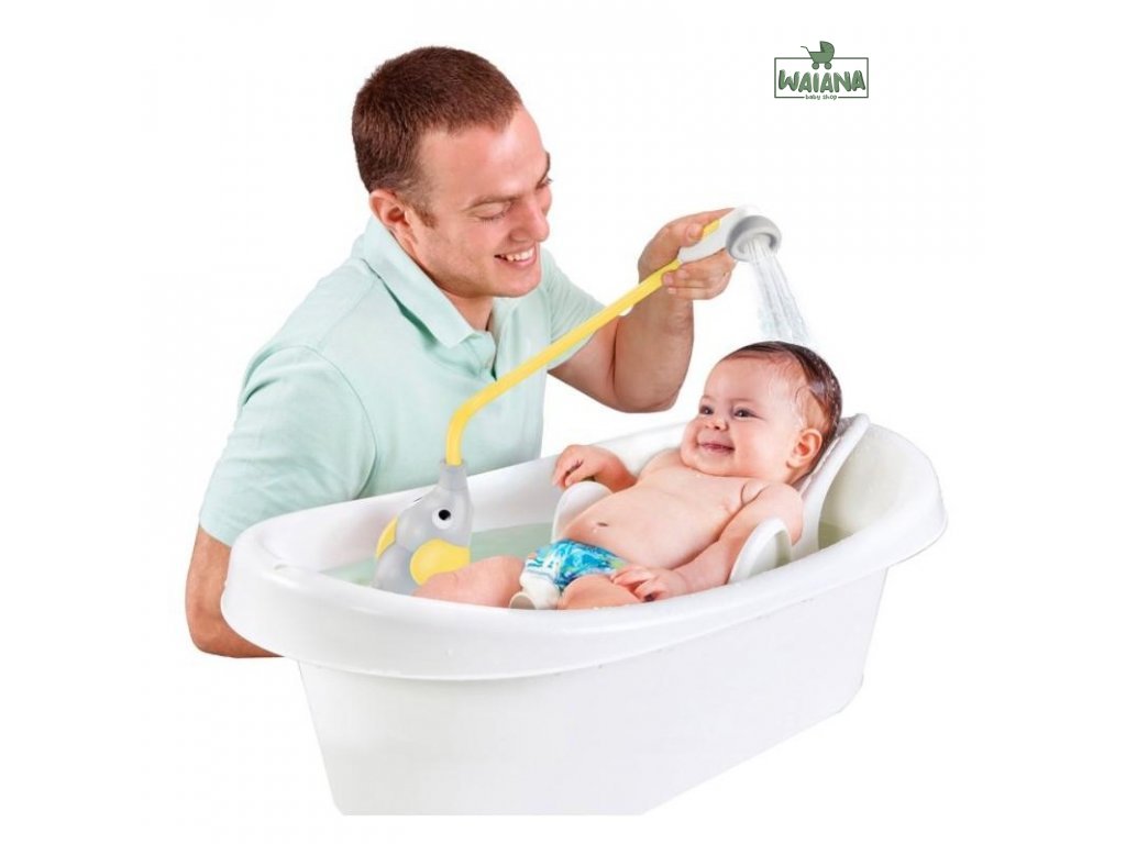 Umiestnite sprchovú základňu slona do vody a zaistite minimálnu hĺbku vody 10 cm. Pre aktiváciu prúdenia vody stlačte tlačidlá umiestnené na bočných stranách sprchovej hlavice. Priložte prúd vody na nohy dieťaťa. Keď je dieťa spokojné, použite sprchu aj na zvyšok tela. Akonáhle dieťa sedí samo, ukážte mu, ako má aktivovať detskú sprchu. Podporuje hygienické návyky, nezávislosť a zábavu.