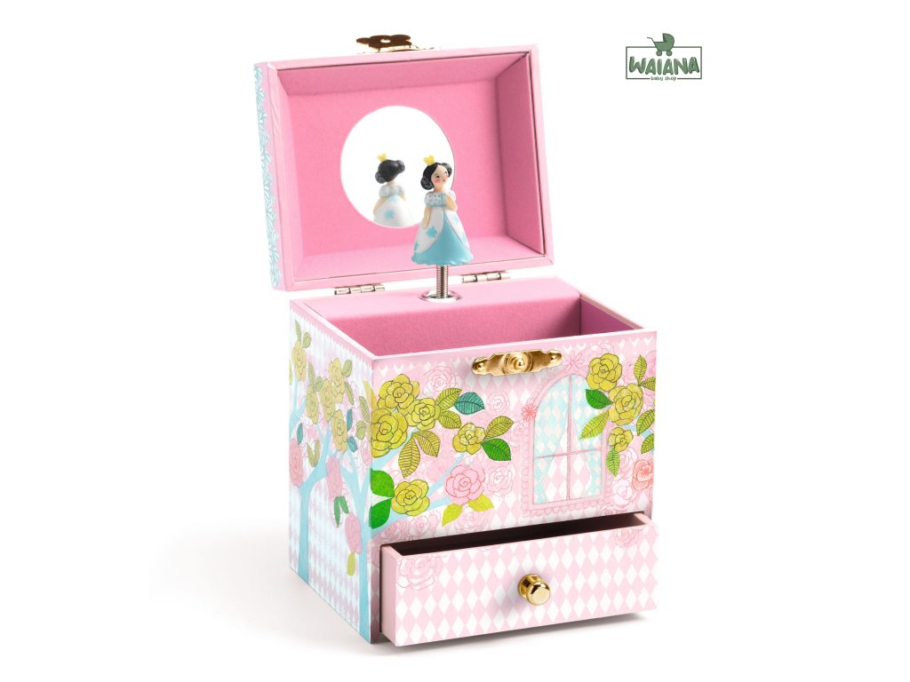 Zámoček: hracia skrinka so zásuvkouKrásna drevená hudobná skrinka s úložným priestoromZámoček – hracia skrinka so zásuvkou je dekoratívna a hravá drevená hudobná skrinka od Djeco v tvare rozprávkového zámočka, ktorá poteší deti aj ako doplnok izby. Po natiahnutí mechanizmu a otvorení veka sa spustí krásna melódia Čarovná flauta (W. A. Mozart).Prečo si vybrať skrinku od Djecovhodná pre deti od 4 rokovjemná hudba pri natiahnutí mechanizmu (cca 2,5 min)točiaca sa figúrka princeznej a zrkadielko vo vnútri2 úložné priestory – priečinok + zásuvka na poklady či šperkyestetický dekoratívny doplnok do detskej izbyObsah baleniadrevená hudobná skrinka v tvare zámočka