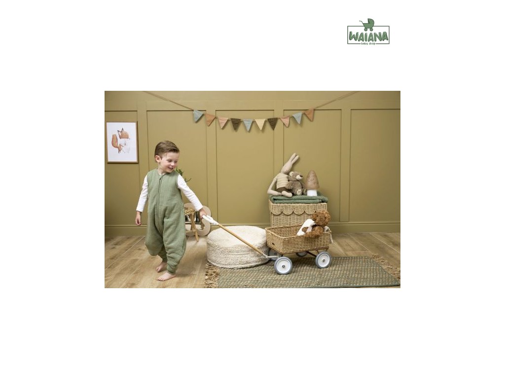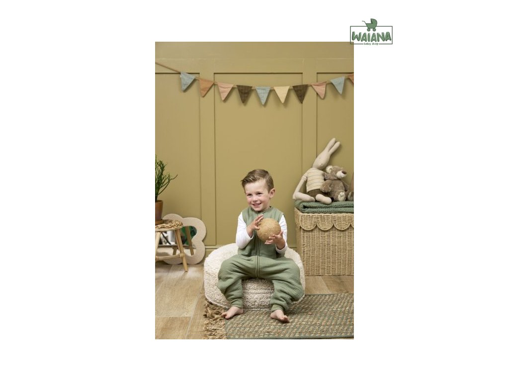 Pohodlný a prodyšný spací vak díky mušelínové tkanině s otvory pro nožičky.